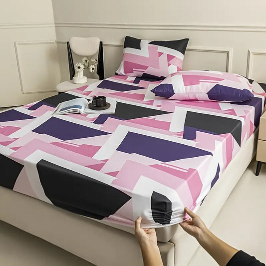 Soft & Hypoallergenic Geometric Print Bedding Set - Includes 1 Fitted Sheet and 2 Pillowcases, Breathable Polyester, Perfect for All Seasons - Ideal for Bedroom, Guest Room, or Dorm, Bed Accessories
