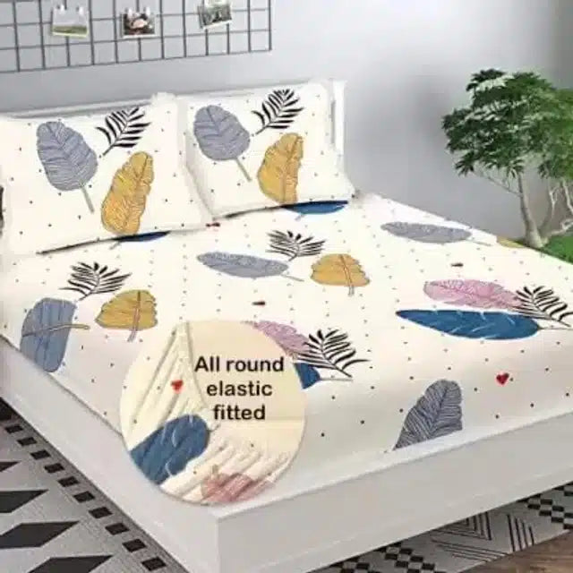Cotton Floral King Size Elastic Fitted Bedsheet (Cream, 90x100 inches)
